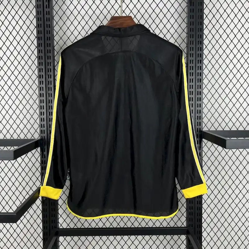 Color base negro: Aporta elegancia y un aire de misterio, destacando en contraste con el color blanco tradicional del Real Madrid. Toques amarillos vibrantes: Presentes en las líneas de los hombros y en los puños, brindan un contraste dinámico y moderno. Cuello polo negro con detalles amarillos: Añade un toque de sofisticación deportiva. Logotipo de Teka en blanco: Posicionado en el centro, destacando como patrocinador de esa época.